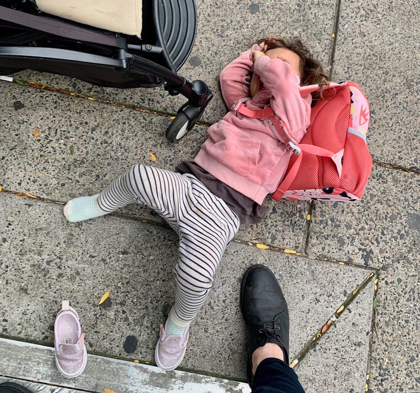 It was fine except at the playground when I tried to put her in the stroller and she bludgeoned my manhood with errant punches and wild kicks. At that moment, as I was crumpled over like a bag of wet sand, I shared a knowing glance with a fellow father who I imagine was just happy it was me, not him, today.