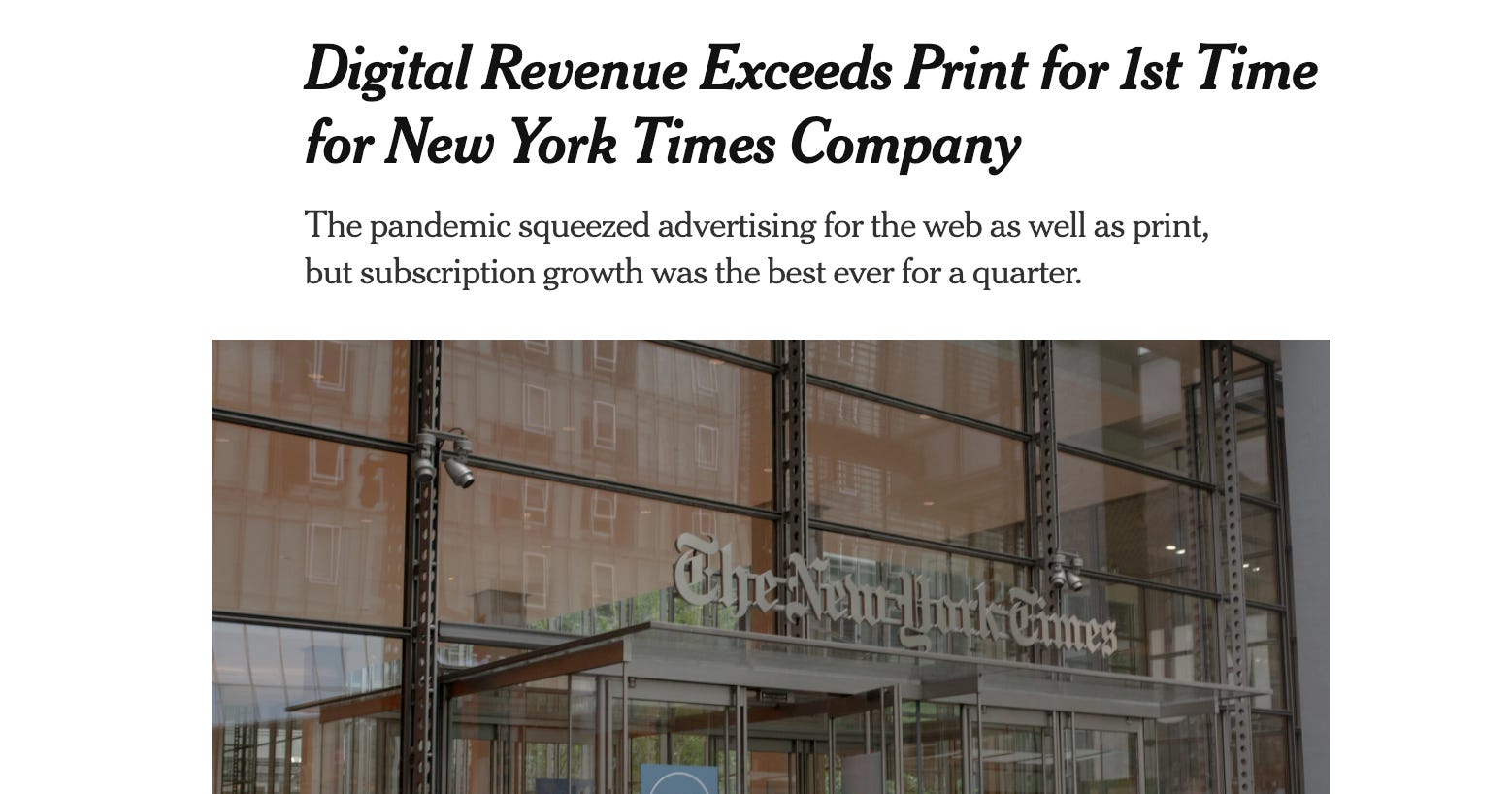And you don’t have to take my petulant word for it. Ask the five million-plus digital subscribers to the New York Times—669,000 of whom came in the last quarter alone, pushing digital revenue past print for the first time.